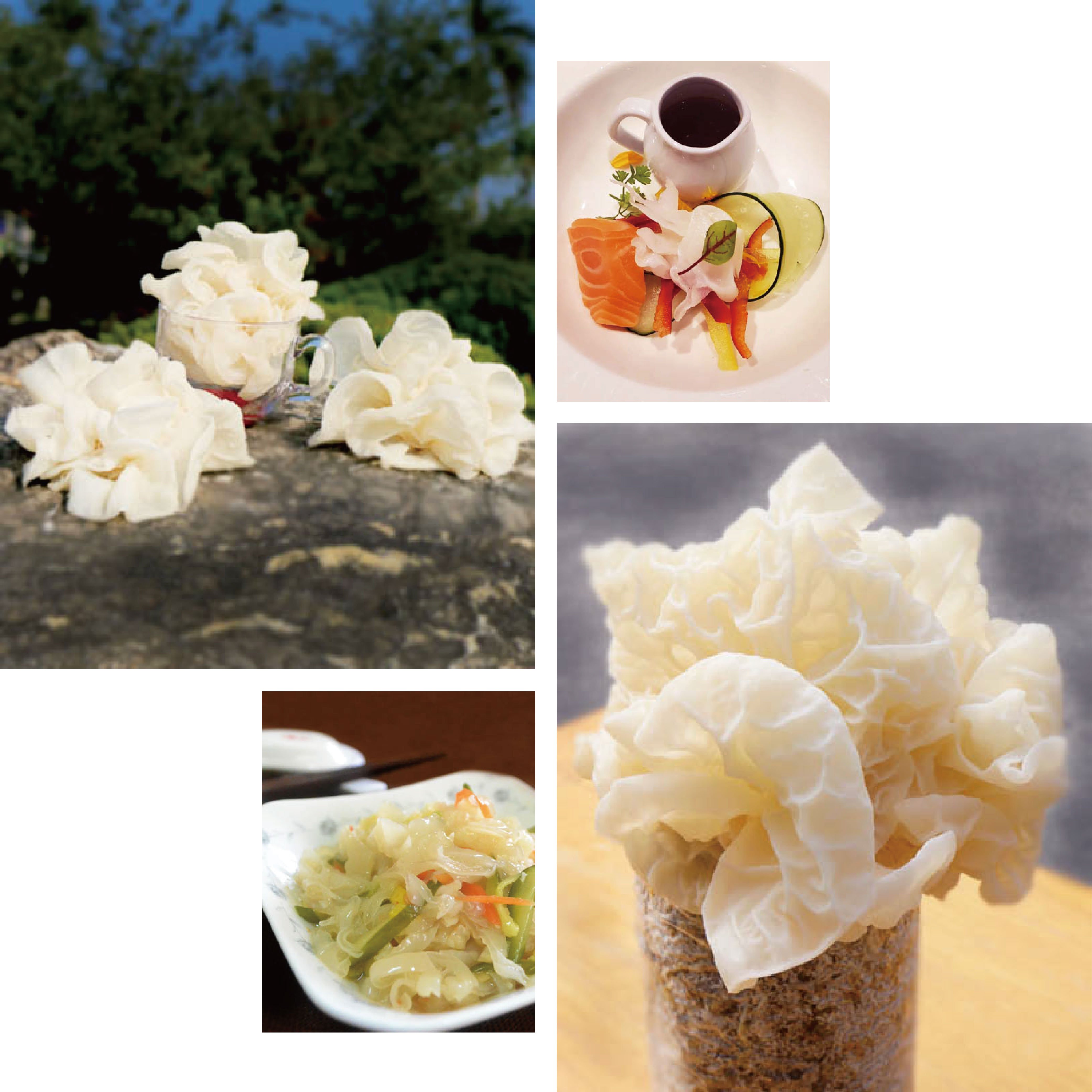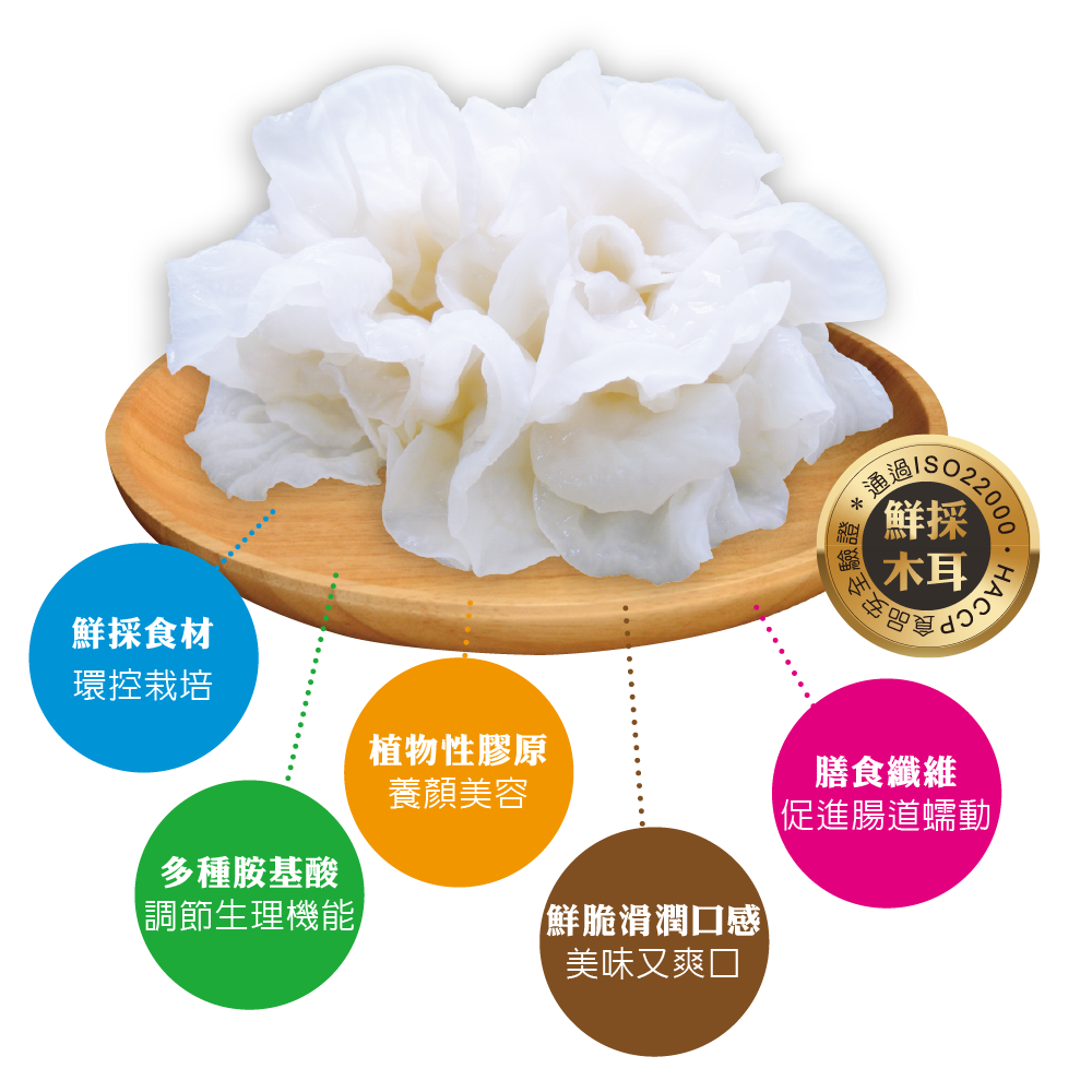 台灣特有品種,體型大,呈牡丹花狀,葉片較厚,其胺基酸高達二十幾種,是所有菇類之最,營養價值高,被視為滋補聖品,向有素燕窩的美譽。 營養學上則指出白木耳含豐富的膠質膳食纖維、多醣體、胺基酸、鉀等多種礦物質,經科學證明有助於調節生理機能,促進新陳代謝,幫助消化道機能,並可促進腸道蠕動、腸道排氣、排便順暢。
